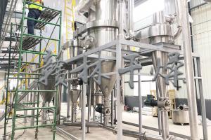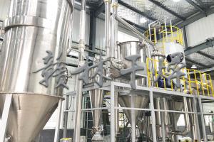 干燥塔包含:塔體、防爆照明燈、氣體分布器、溫控設備、泄壓裝置、進風管路、出風管路、氧含量測量傳感器等部件,進風管路內部需要設置過濾裝置;霧化后的漿料在熱空氣的加熱作用下,漿料完成揮發和干燥成為粉料落向底部的出料口,氣體從排風管排除進行閉路循環管路,干燥塔材質:304不銹鋼。